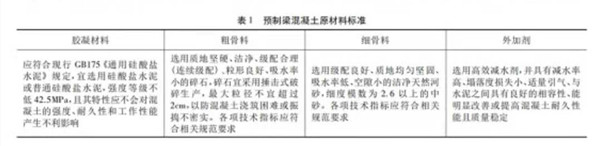 在預制梁的生產過程中,對于原材料的選擇是非常重要的,即要對施工材料品質進行控制。預制混凝土梁的原材料包括膠凝材料、粗骨料、細骨料和外加劑等,其控制標準如表1所示。
