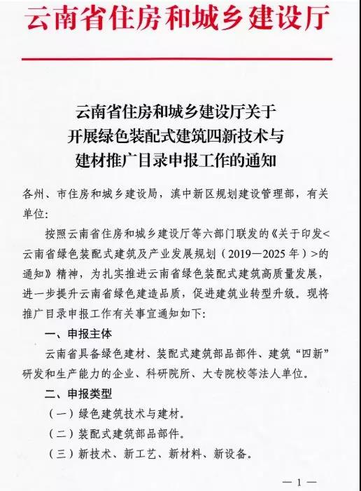 2020年3月17日,云南省住房和城鄉(xiāng)建設(shè)廳關(guān)于印發(fā)《開展綠色裝配式建筑四新技術(shù)與建材推廣目錄申報(bào)工作》的通知,內(nèi)容強(qiáng)調(diào):